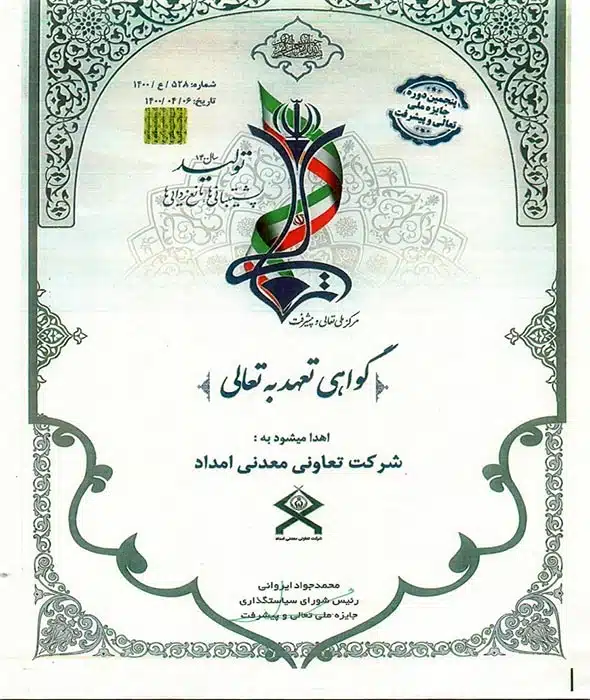 • اخذ گواهی تعهد به تعالی در پنجمین دوره جایزه ملی تعالی و پیشرفت (در ادامه تصویرگواهی ارائه شده است)
