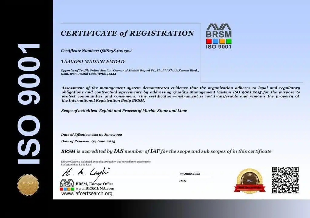 • استقرار و پیاده سازی سیستم مدیریت کیفیت بر اساس استاندارد ISO 9001:2015 (در ادامه تصویر گواهی ارائه شده است)